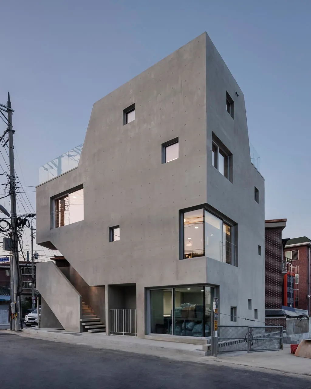 برشهای عمودی که در نما ایجاد شدهاند، نور طبیعی را به عمق فضای داخلی هدایت کرده و شکل یکپارچه و صلب ساختمان را تلطیف میکنند.