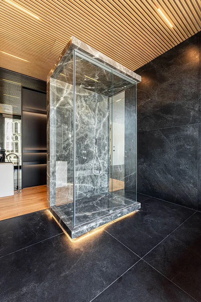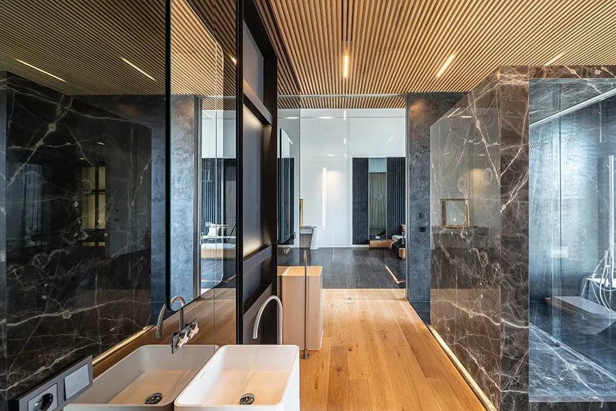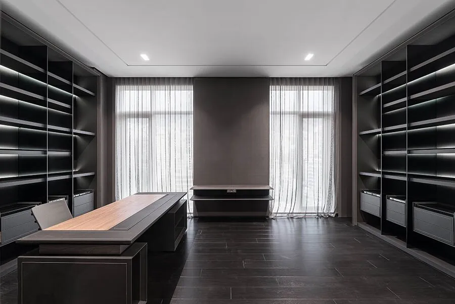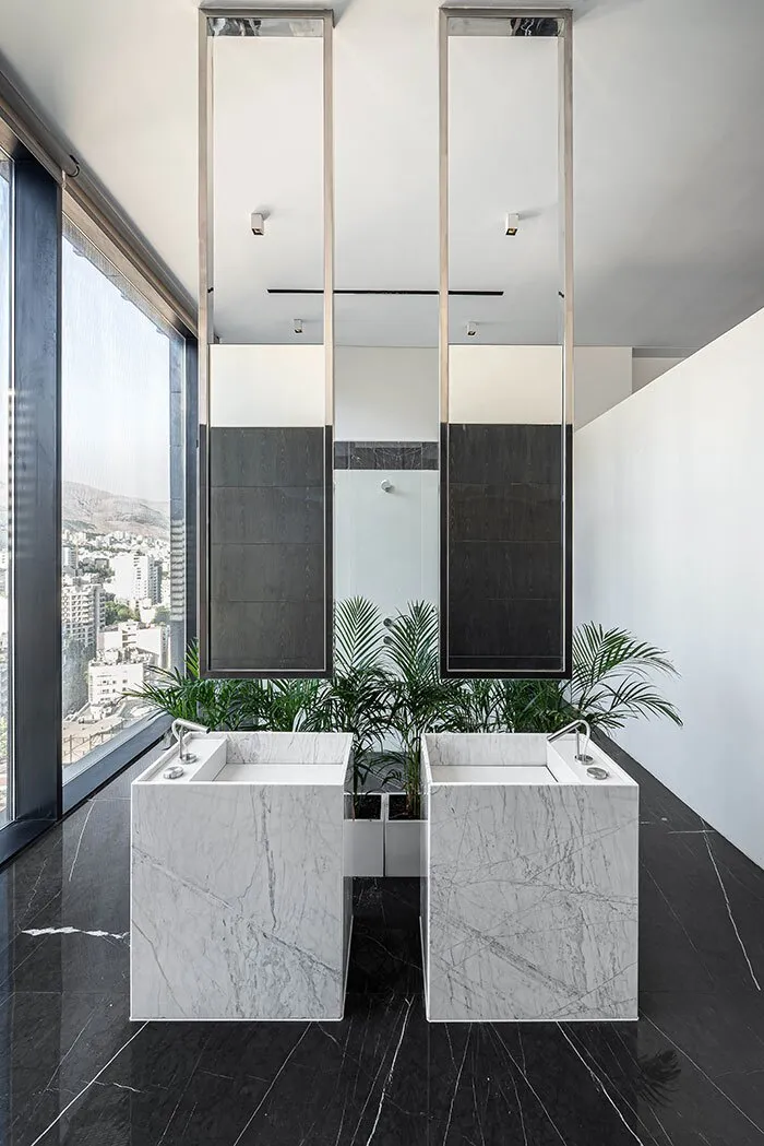 راه پله اصلی از فضای نشیمن به سوییت اداری نقطه کانونی و مونومنتال نشیمن محسوب می شود. حمام سوییت اداری با ایدهای طبیعت محور در برگیرنده باغچه هایی با گیاهان عمودی است که فضایی راحت و آرامش بخش می آفریند. فضای سوییت اداری امتدادی میان حمام، محل کار و خواب است.