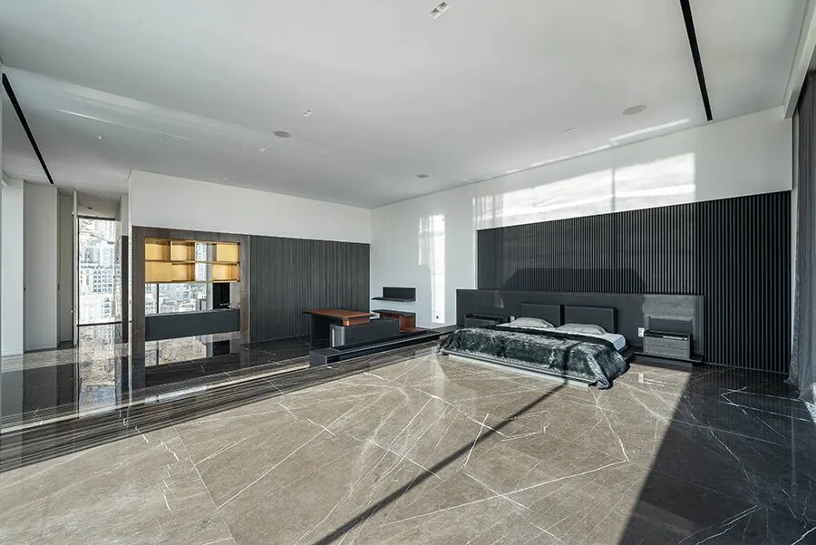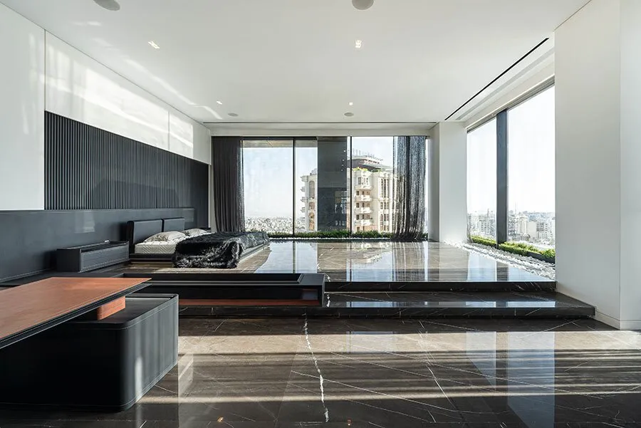 پنت هاوس دربرگیرنده حیاط های خصوصی چون تراس، باغ بام و استخر است. در این طراحی داخلی دوبلکس، یک سوییت اداری در طبقه دوم واقع شده که به حیاط اختصاصی خانه اشراف دارد. ایده سیالیت و پویایی جریان اصلی شکل دهنده پروژه در تمامی سطوح و فضاهای آن مانند فضای اصلی نشیمن، اتاق خواب اصلی، اتاق کار، سوییت اداری و فضاهای بیرونی است که امکان حرکت و سیر پیوسته در کل بنا را فراهم می سازد.