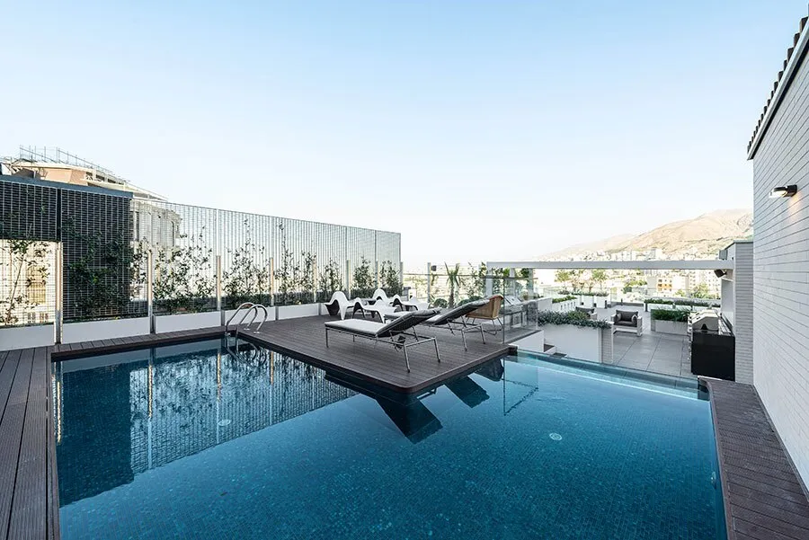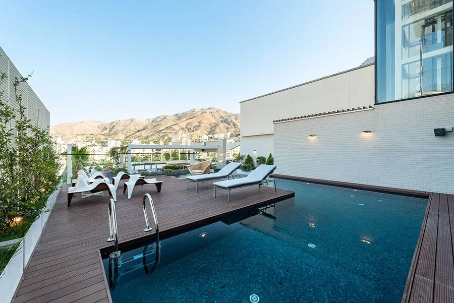 در گام نخست محصورترین موقعیت که دسترسی مناسبی از فضای داخلی نیز داشت، جهت جانمایی استخر انتخاب شد. این زون در فضایی میان حجم بنا و آسانسور شیشه ای داخل واحد در جنوب شرقی بام است. زون ۱ از سوییت اداری مشرف به بام دید مطلوبی دارد. همچنین جهت کم رنگ کردن دید به استخر و تراس آفتاب مجاور آن از دو جبهه غرب و جنوب حصارهای مجوف آهنی با جعبه های گل و گیاهان رونده استفاده شده است. در شمال استخر در امتداد آسانسور و در نزدیکترین نقطه به ورودی فضاهای خدماتی چون دوش، رختکن و سرویس بهداشتی جانمایی شدند.