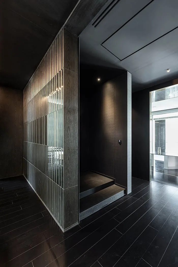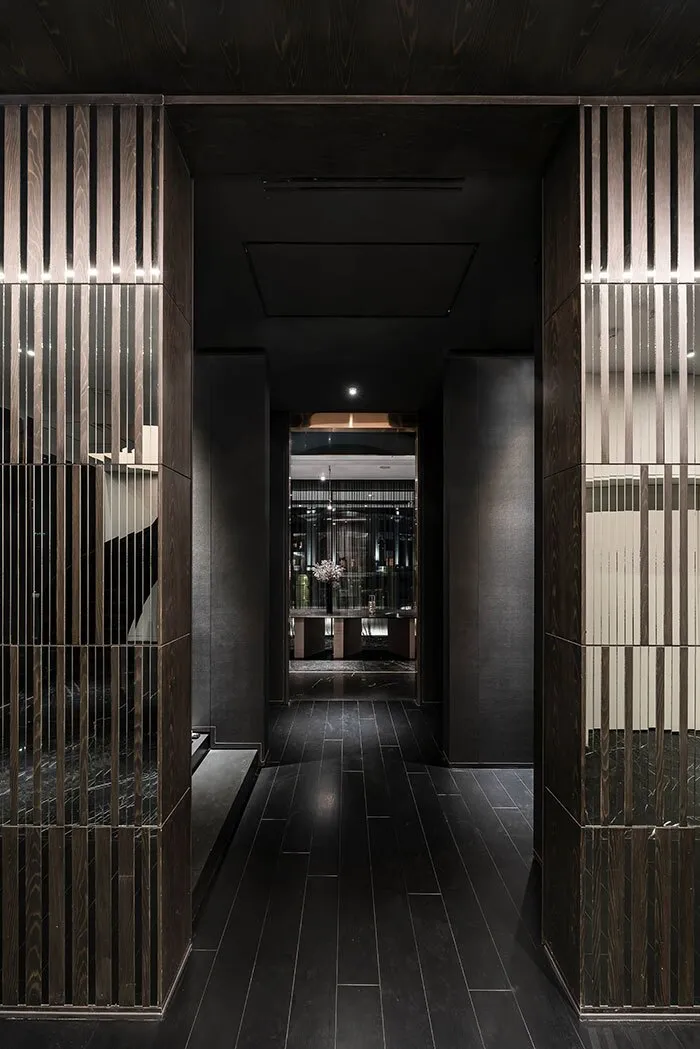 به دلیل توزیع کافی عناصر در این فضاها، ترکیب بندی بصری به وجود آمده از زوایای مختلف قابل درک است و در عین حال یکدستی و تعادل در مصالح و مبلمان حفظ شده است و با رنگ های گرم و تیره شناخته می شود. از دیگر سو، بخش خصوصی خانه با غلبه رنگ های خنثی از طیف سفید و خاکستری در کنار سادگی، محیطی راحت خلق کرده است. هال ورودی مفصل رابط این دو بخش است. مکعبی تیره مرکب از آینه و چوب که انتقال تدریجی میان فضای خصوصی و نیمه خصوصی را بر عهده دارد.