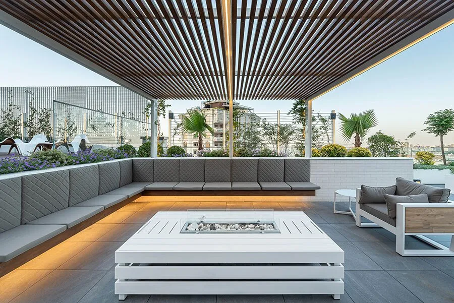 حیاط خانه فضایی باز با مساحت تقریبی ۴۸۰ مترمربع است که به خانواده و دوستاناشان امکان لذتبردن از آفتاب، هوای تازه، منظر گسترده به شهر و طبیعت پیرامون را می دهد. برنامه فیزیکی بام بر اساس نیازهای کارفرما و امکانات موجود ترکیبی از سه فضای اصلیِ استخر اختصاصی، فضای گردهمایی خانوادگی و فضایی نسبتا وسیع جهت برگزاری مهمانی، را در بر گرفت. این حیاط از امکاناتی چون، فضای باربیکیو، تراس آفتاب و ناهارخوری برخوردار است که با الگوی کاشتی ظریف محاط شده است.