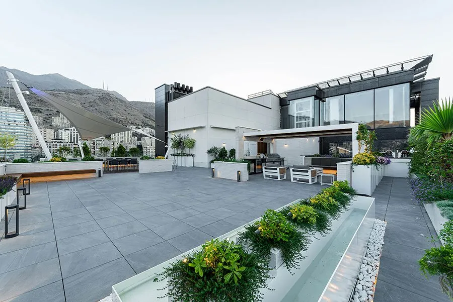 در طراحی پنت هاوس پارامیس گاردن انتخاب متریال بام نیز به گونه ای بود که کاربر تجربه فضایی کاملا متفاوتی با داخل بنا داشته باشد، از اینرو از آجر و سیمان سفید برای پوشاندن دیوارها استفاده شد. ترکیب رنگ سفید با الوارها و پروفیلهای رنگ چوب و پوشش گیاهی در تحقق این امر نقش داشته است. انتخاب کف کاذب نیز از دیگر آیتم های تاثیرگذار پروژه است که هم از شکستگی سطوح به لحاظ شیب بندی جلوگیری می کند و هم سهولت دسترسی به تاسیسات و امکان تعمیر و نگهداری را فراهم می آورد.
