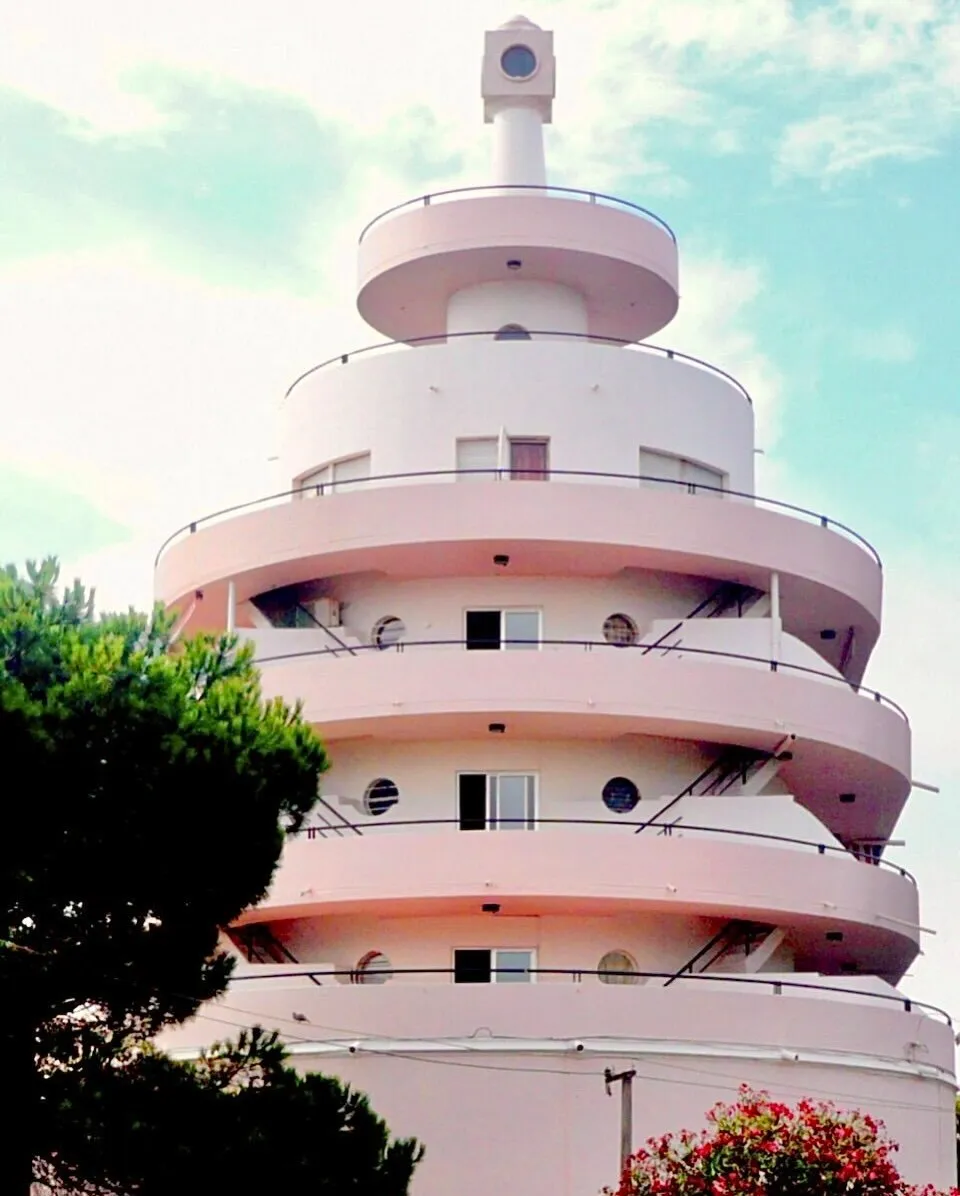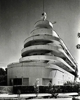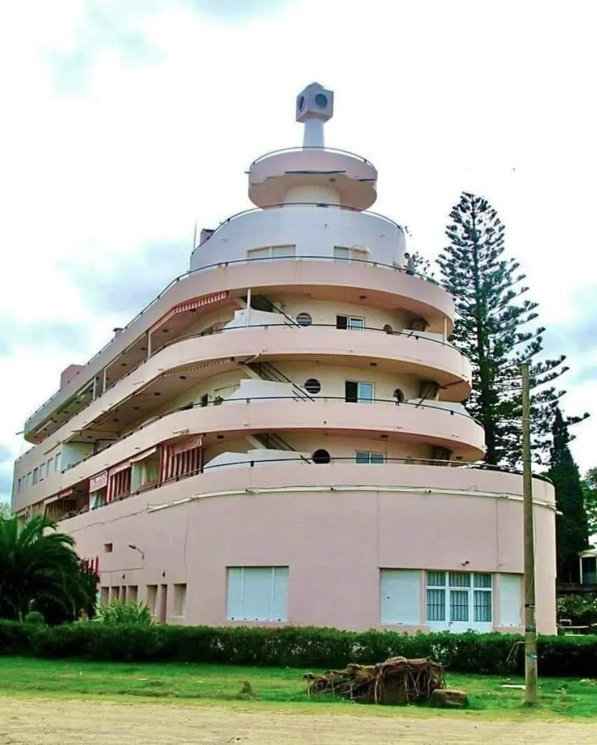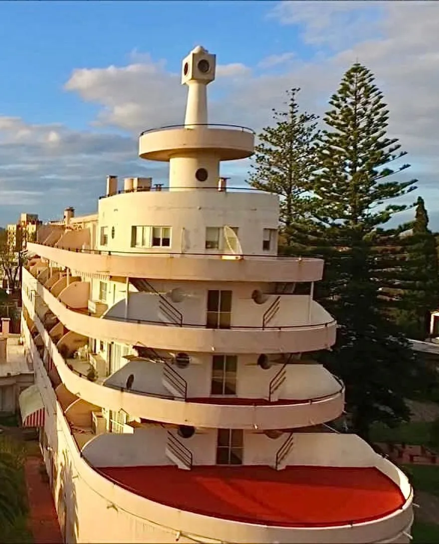 نمای بیرونی هتل پلانتا پالاس در اروگوئه با طراحی به شکل کشتی و بالکن‌های منحنی به سبک معماری مدرن سال ۱۹۳۹.