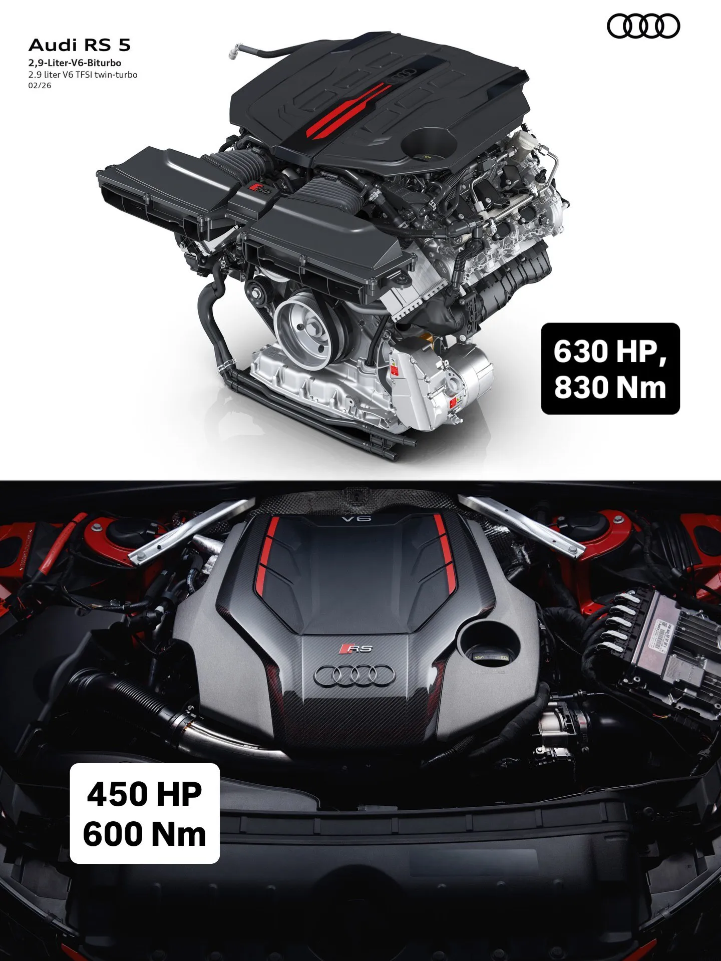 آئودی RS 5 جدید به یک موتور ۲.۹ لیتری V6 توئین توربو مجهز شده است که در کنار یک موتور الکتریکی یکپارچه با سیستم انتقال قدرت، فعالیت می‌کند. این مجموعه فنی در مجموع توان خروجی خیره‌کننده ۶۳۰ اسب بخار و گشتاور ۸۳۰ نیوتن‌متر را تولید می‌کند. بر اساس داده‌های رسمی، این خودرو تنها در ۳.۶ ثانیه از سکون به سرعت ۱۰۰ کیلومتر بر ساعت می‌رسد و حداکثر سرعت آن ۲۹۰ کیلومتر بر ساعت است.