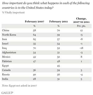 گفتني است كه موسسه گالوپ در سال 2007 نيز چنين نظرسنجي انجام داده بود كه در آن نظر سنجي اهميت كشورها به ترتيب اولويت به شرح زير بود: