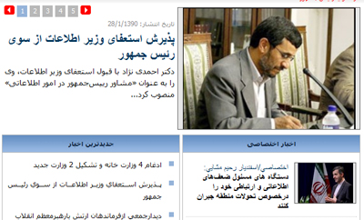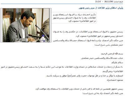 عملکرد جالب خبرگزاری ایرنا: این خبرگزاری تا کنون (23:40) خبری در مورد ابقای مصلحی منتشر نکرده و با "رسمی" دانستن خبر خود، صرفا خبر خبرگزاری های دیگر (فارس) را به صورت "ادعا" بازتاب داده است. تاکنون ایسنا، مهر، فارس و ... خبر ابقای مصلحی را منتشر کرده اند.