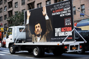 مجموعه " علیه ایران هسته ای ، متحد هستیم" همچنین از چند روز پیش با اجاره کردن یک دستگاه کامیون و نصب پلاکارد بزرگی بر روی آن با نوشته های ضد احمدی نژاد، تبلیغات علیه رئیس جمهور ایران را در منطقه منهتن محل استقرار ساختمان سازمان ملل متحد در شهر نیویورک آغاز کرده است.