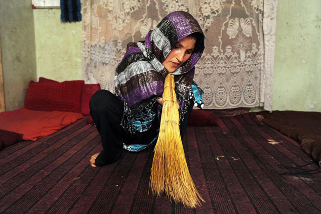 "پری" زن 33 ساله در هرات افغانستان کگه دستانش را در حمله هوایی ارتش سرخ شوروی در دهه 1980 از دست داده در حال جارو کردن خانه اش است