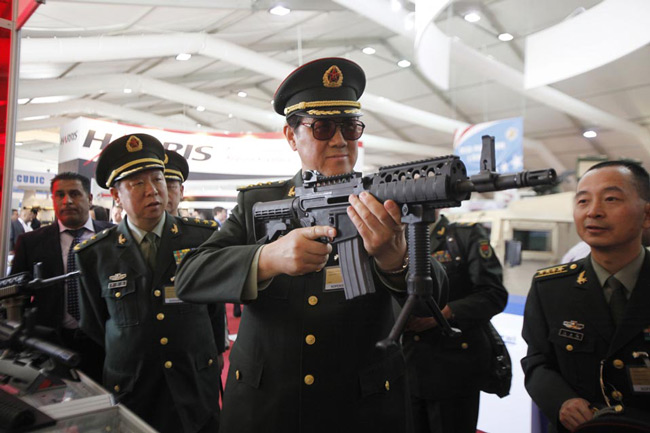یک افسر چینی در حال بررسی یک سلاح آمریکایی در نمایشگاه نظامی در امان