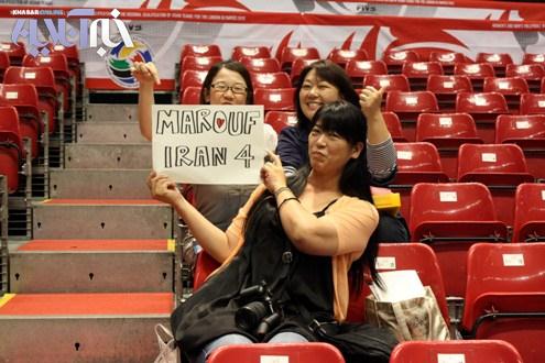 چند خانم ژاپنی که برای تشویق ملی پوشان به سالن آمده بودند کاغذی به دست داشتند که روی آن به انگلیسی نوشته بود: «سعید معروف». آنها طرفدار این بازیکن تیم ملی کشورمان بودند و با دیدن دوربین های ایرانی علاقه خود را اینگونه نشان دادند.