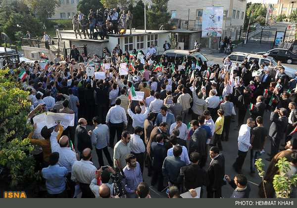 حامیان احمدی نژاد همچنین پوستری در دست داشتند که محتوای آن ، سفرهای او به نیویورک را "حماسه" دانسته و بر روی آن نوشته شده بود: "حسن ختام 8 حماسه ... او می آید" !