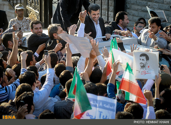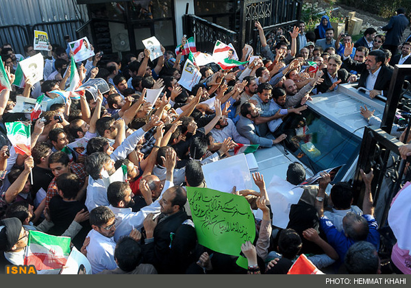 حامیان رئیس جمهور شعارهایی نظیر "صلی علی محمد یاور رهبر آمد"، "محمود دوستت داریم"، "احمدی ساده زیست، ریشه کن صهیونیست"، " چپ، راست، کارگزار، علیه خدمتگذار" و " احمدی زنده باد ، مشایی پاینده باد" سر می دادند.