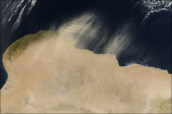 غبار در دریا، وزش خاک و غبار به سواحل لیبی و دریای مدیترانه در اوایل فوریه