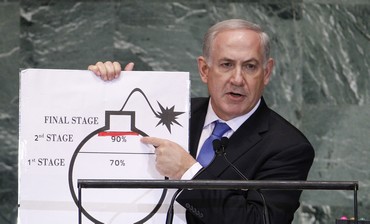 نتانیاهو در سخنرانی مهر ماه سال گذشته خود در مجمع عمومی سازمان ملل با ترسیم یک بمب روی یک کاغذ و کشیدن یک خط قرمز روی آن مدعی شد که ایران تا تابستان سال آینده ( امسال) قادر خواهد بود به مرحله برگشت ناپذیر در فرایند توسعه قابلیت های هسته ای خود برسد و اسراییل تا این زمان به جامعه جهانی فرصت می دهد که جلوی پیشرفت برنامه های هسته ای ایران را بگیرد.