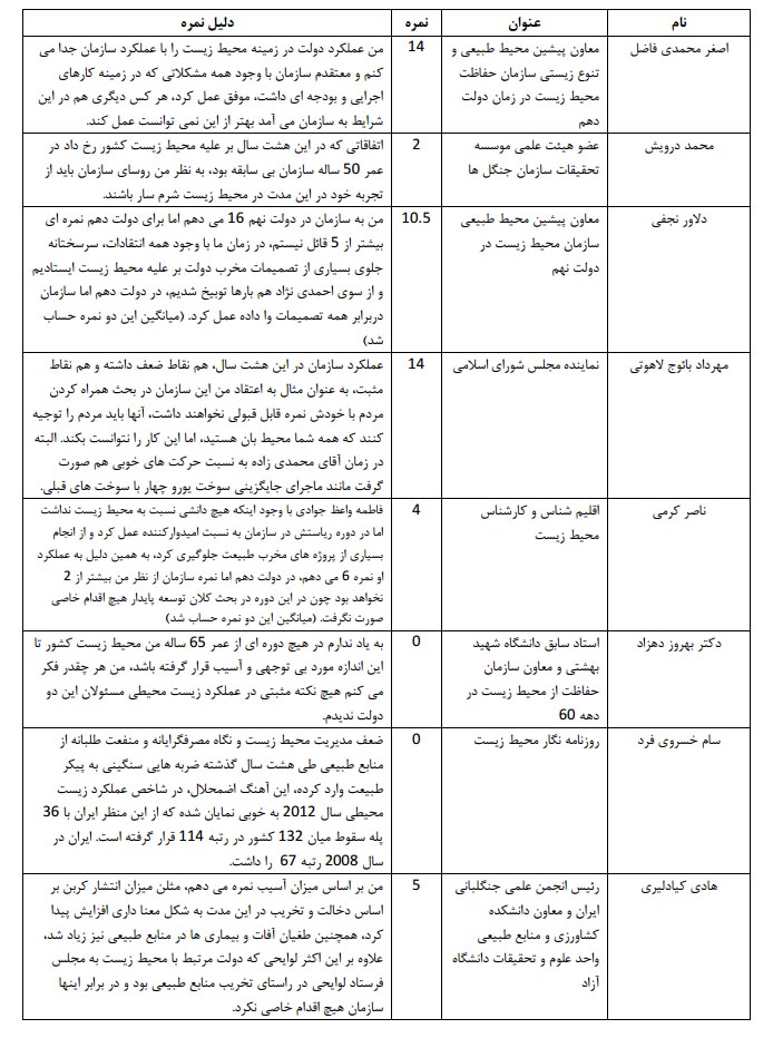 در این رتبه بندی نورالله مرادی مدیرکل سابق روابط عمومی سازمان حفاظت محیط زیست در ابتدای دولت دهم هم مورد پرسش قرار گرفت اما حاضر به نمره دهی به عملکرد این سازمان نشد. با محاسبه نمره های داده شده و گرفتن معدل از آنها، نمره ای که کارشناسان مورد پرسش قرار گرفته در این گزارش  به عملکرد هشت ساله سازمان حفاظت از محیط زیست داده اند برابر با 6.18 است.