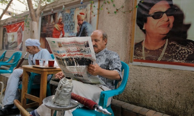 مرد مصری در حال خواندن گزارش دادگاه محمد مرسی از روزنامه الاهرام