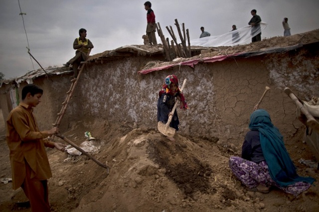 خانواده پاکستانی در حال ساخت خانه گلی در حومه اسلام آباد