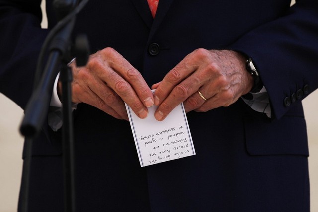 نوشته در دست جان کری وزیر خارجه آمریکا پس از شرکت در کنفرانس خبری مشترک با محمود عباس رییس تشکیلات خودگردان فلسطین