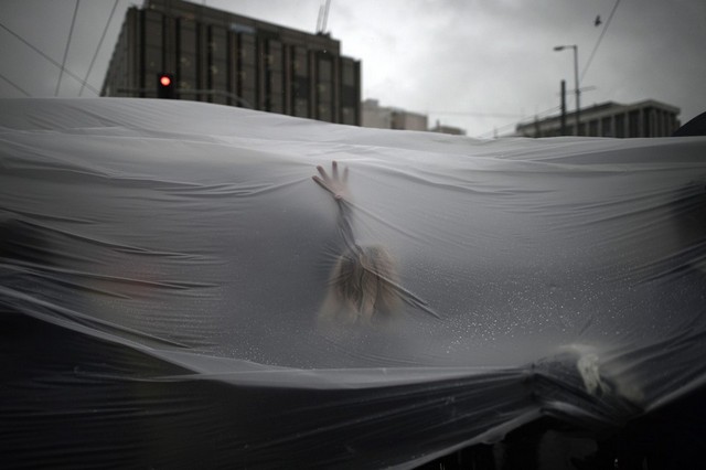 راهکار تظاهرات کنندگان علیه سیاست های ریاضت اقتصادی دولت یونان در آتن برای ایمن ماندن از باران