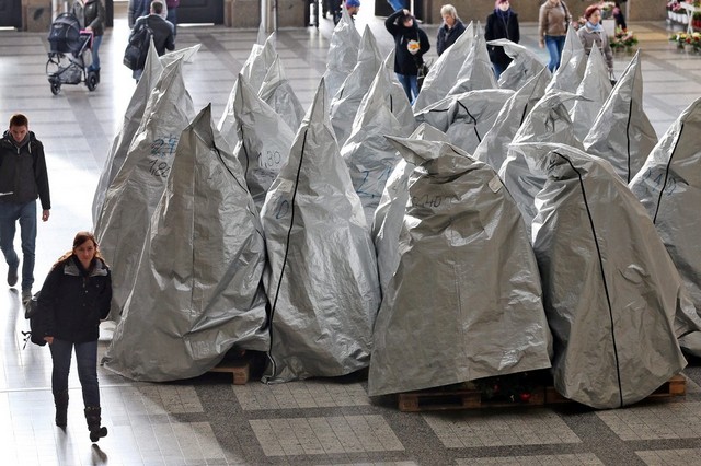 درختان کریسمس با پوشش در ایستگاه قطار لایپزیک آلمان