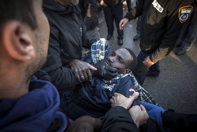 دستگیری یک مهاجر آفریقایی معترض از سوی پلیس مهاجرت اسراییل در شهر قدس