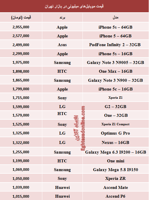 قیمت‌ موبایل‌های‌ میلیونی پایتخت (جدول)
