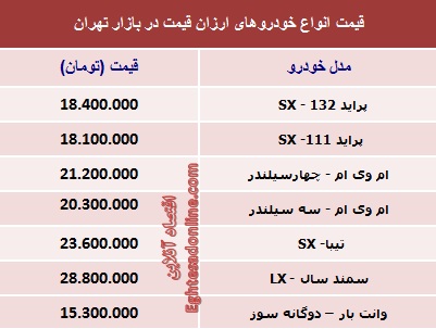 قیمت روز خودروهای صفر ارزان‌قیمت بازار تهران در روز شنبه شانزدهم فروردین ماه به شرح زیر است؛