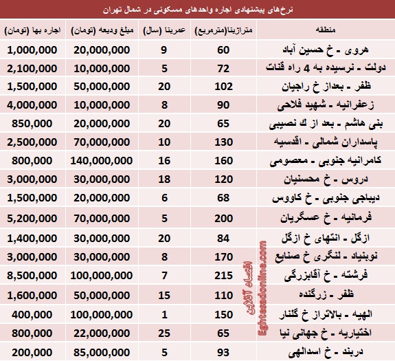 قیمت جدید رهن و اجاره انواع واحدهای مسکونی در متراژ و سن ساخت متفاوت در مناطق شمالی تهران به شرح جدول زیر است؛