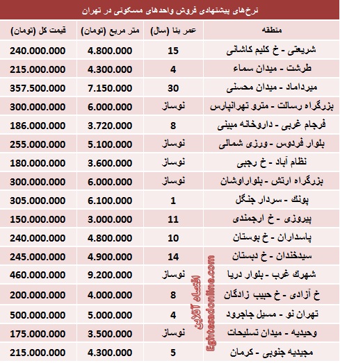 آنچه در زیر میآید جدول قیمت روز انواع آپارتمان های 50 متری در مناطق مختلف شهرداری تهران به پیشنهاد مالک است؛