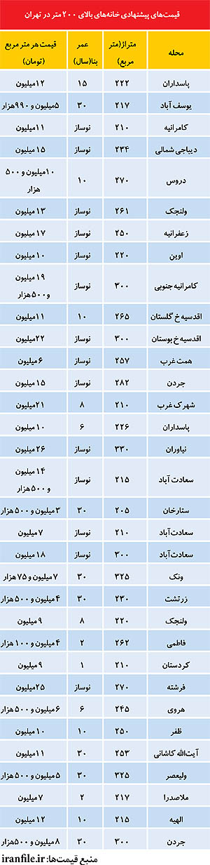 نرخ گران‌ترین آپارتمان‌های پایتخت (+جدول)تصور اینکه خانه‌های بزرگ ارزان‌تر از خانه‌های کوچک هستند با بررسی قیمت‌ آپارتمان‌های بالای 200 متر از بین خواهد رفت. این خانه‌ها معمولا بر اساس ویژگی‌هایی که دارند از قیمت میانگین منطقه بسیار بالاتر هستند.