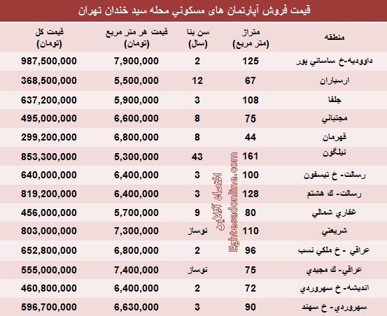 قیمت آپارتمان در سیدخندان تهران (جدول)