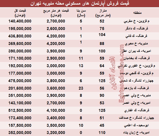 قیمت آپارتمان در منیریه تهران (جدول)