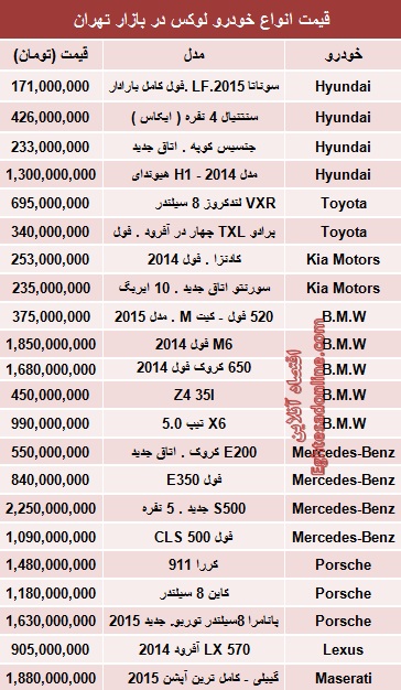 قیمت خودروهای لوکس در بازار تهران (جدول)