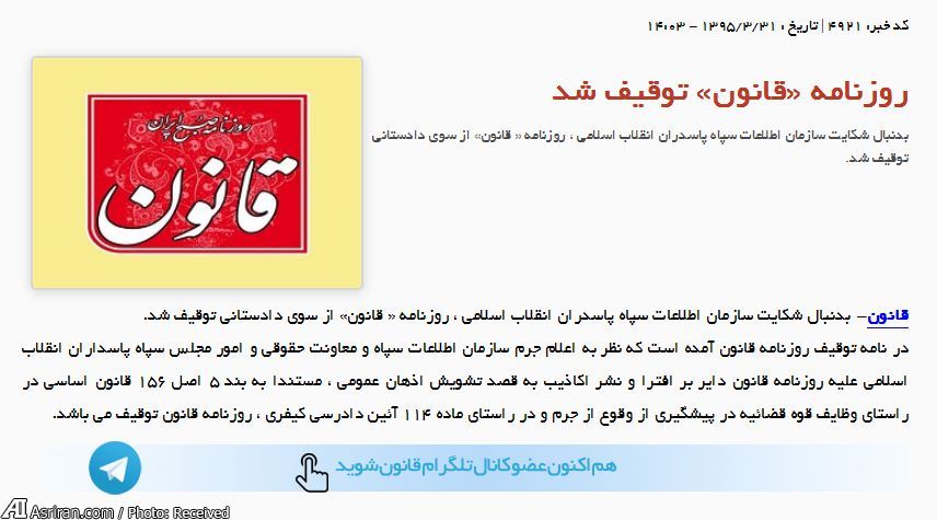 به گزارش عصر ایران به نقل از سایت روزنامه قانون، در نامه توقيف روزنامه قانون آمده است كه نظر به اعلام جرم سازمان اطلاعات سپاه و معاونت حقوقي و امور مجلس سپاه پاسداران انقلاب اسلامي عليه روزنامه قانون داير بر افترا و نشر اكاذيب به قصد تشويش اذهان عمومي ، مستندا به بند 5 اصل 156 قانون اساسي در راستاي وظايف قوه قضائيه در پيشگيري از وقوع از جرم و در راستاي ماده 114 آئين دادرسي كيفري ، روزنامه قانون توقيف مي باشد.