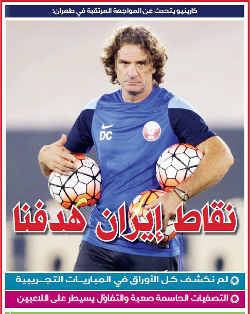 کارنینیو در اولین سئوال خبرنگاران قطری گفت:« من برای تمام تیم های حاضر در این گروه احترام قائل هستن به خصوص برای ایران که شک ندارم قوی ترین تیم گروه است اما همین تیم هم مثل سایر تیم ها ضعف هایی دارد که می توان با استفاده از آن به هدف رسید. ما در یک ماه گذشته این ضعف ها را شناسایی و روی آن کار کردیم تا گام اول را محکم برداریم».