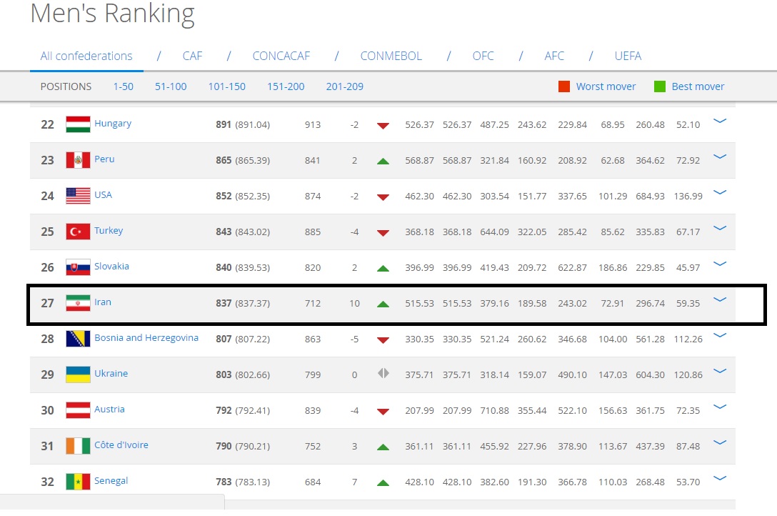 لاله های نارنجی، با 4 پله صعود بالاخره به جمع 20 تیم برتر رده بندی فیفا راه پیدا کردند و ایسلند نیز در راستای روند رو به رشد خود، صعودی 6 پله ای را تجربه کرد و به رتبه بیست و یکم تکیه زد. مجارستان، پرو، آمریکا، ترکیه و اسلوونی با اختلاف امتیاز نه چندان زیادی بالاتر از ایران قرار دارند و ممکن است تا ماه های آینده و در صورت ادامه نتایج خوب تیم ملی، ایران بتواند از این تیم های قدرتمند نیز پیشی بگیرد و خود را به جمع 20 تیم اول نزدیک تر کند.