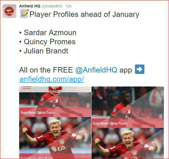 بنا به نوشته سایت Anfield HQ علاوه بر سردار آزمون مهاجم 22 ساله ایرانی که با روستوف درخشش خوبی داشته برانت آلمانی  از باشگاه لورزکوزن  همچنین کوینس پرومس، وینگر هلندی باشگاه اسپارتاک مسکو دیگر گزینه های قطعی یورگن کلوپ برای تقویت خط حمله لک لک ها هستند که به احتمال زیاد به زودی راهی انگلیس خواهند شد تا پس از مراحل نهایی انتقال قرارداد خود را با این باشگاه محبوب در ژانویه امضا کنند.