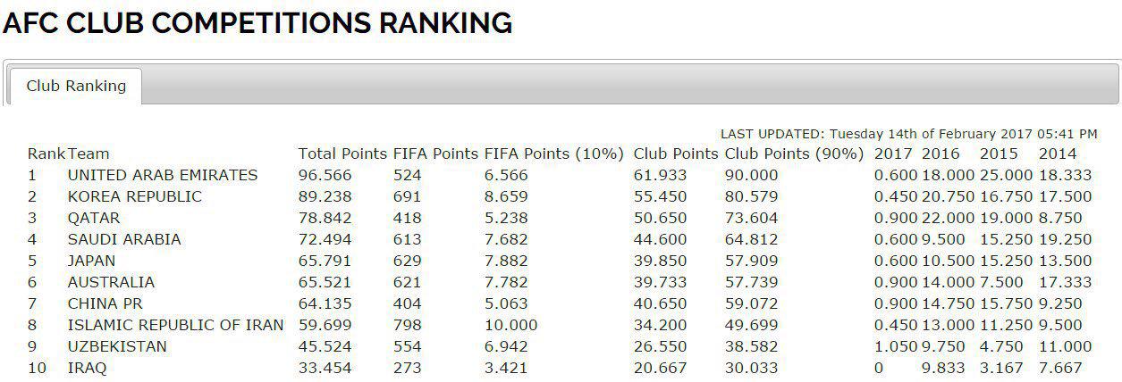 جدول اعلام شده در رده بندی لیگ های آسیایی نشان می دهد سال آینده فوتبال ایران سهمیه 2 تیمی در لیگ قهرمانان آسیا خواهد شد. طبق این جدول ایران از رده چهارم لیگ های آسیایی به رده هشتم سقوط کرده این در حالی است که تا امسال و به دلیل تاثیربالای رتبه تیم ملی در جایگاه لیگها ایران رتبه خوبی داشت اما امسال اثرتیم ملی را کم کرده اند و در نتیجه ایران سقوط کرده . با این رتبه اصلا عجیب نیست که سهمیه ایران از 4 به 2 کاهش پیداکند.