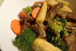 بیبی کورن را از طول برش بزنید و به همراه گل کلم، هویج، فلفل دلمه ای و کلم بروکلی به گوشت بیفزایید و خوب تفت دهید.