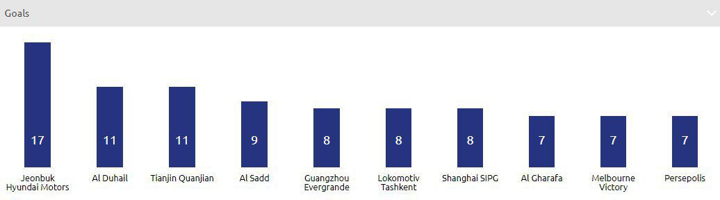 البته بهترین تیم هجومی چونبوک موتورز است که با 17 گل فاصله بسیار زیادی با تیم های دیگر ایجاد کرده است و پشت سر او به ترتیب الدحیل و تیانجین با 11 مرتبه گلزنی قرار دارند. پس از این دو السد که همگروه و رقیب اصلی پرسپولیس برای صعود است، با 9 گل زده قرار دارد و تیم های گوانگژو و لوکوموتیو تاشکند هم 8 گله هستند.