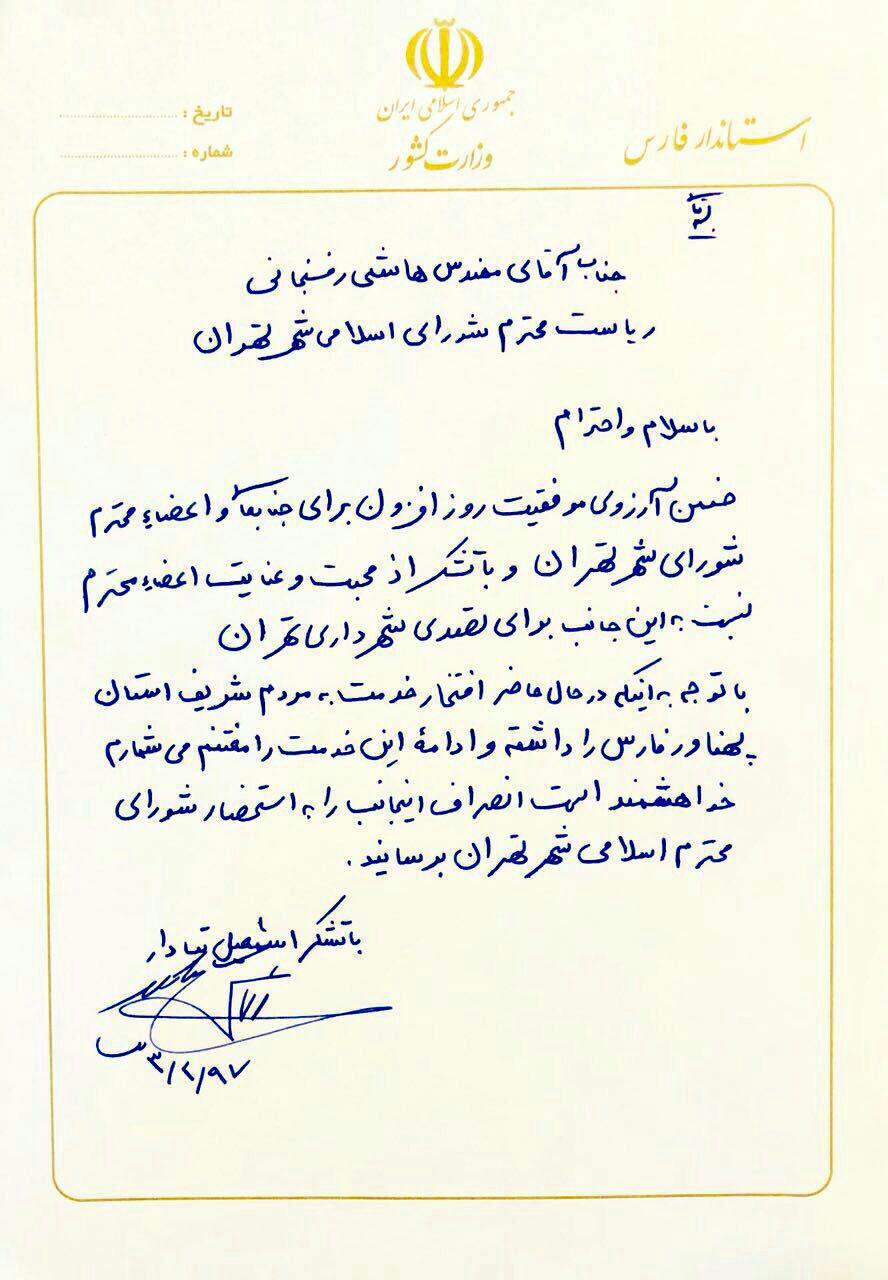 انصراف استاندار فارس از کاندیداتوری شهرداری تهران