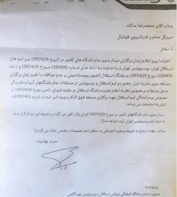 در نامهای که در اختیار باشگاه پرسپولیس قرار گرفته به صراحت اعلام شده با توجه به نظر نماینده باشگاه استقلال در جلسه تامین مبتنی بر عدم حضور در این بازی و بازگشت آبیها دو روز بعد از زمان اعلام شده به ایران، آنها در آن شرکت نمیکنند و پاسخ این درخواست برای لغو بازی نیز طی نامهای به باشگاه ارسال شده بود.