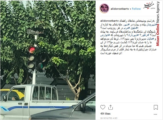 به گزارش میزان، علی درستکار مجری مشهور صدا و سیما در صفحه شخصی خود در اینستاگرام نوشت: بهراستی پوشیدهماندن نمادهای راهنمای شهروندان پیاده و سواره در شهر، مایۀ پامالی چه اندازه از حقوق مردم در هر روزوشب است؟!