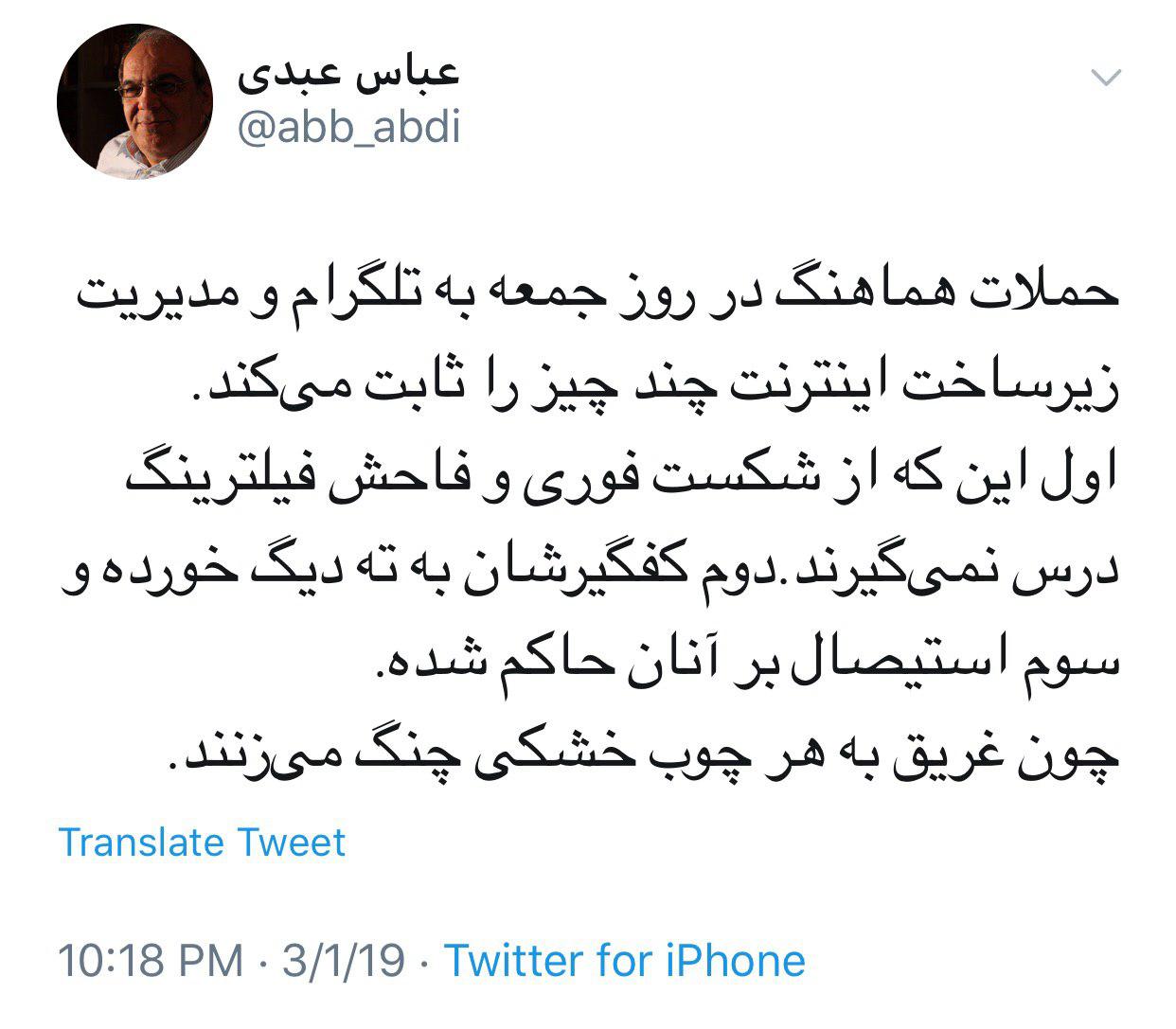 عباس عبدی: حمله کنندگان به تلگرام به هر چوب خشکی چنگ می زنند