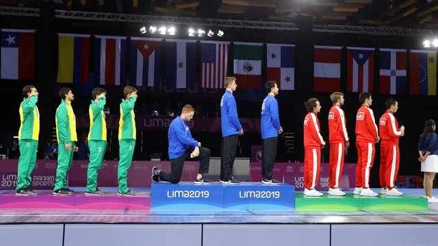 گوین بریبه هنگام توزیع مدال بازی‌های پان آمریکن که در پرو برگزار شد، دست خود را مشت کرد و به نشان اعتراض به سیاست‌های دونالد ترامپ بالا برد و ورزشکار دیگر یعنی ایمبودن هنگام پخش سرود آمریکا به نشانه اعتراض زانو زده بود.