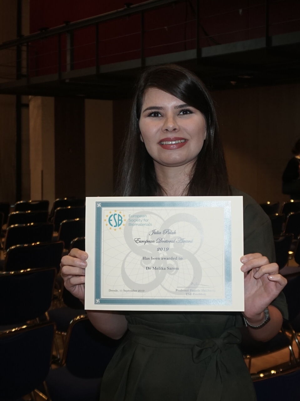 به گزارش ایرنا به نقل از پایگاه اینترنتی دانشگاه فرایبورگ، کمیته شورای انجمن بیومواد اروپا، جایزه دکترای «جولیا پولاک» جامعه اروپا در ۲۰۱۹ را به دکتر ملیکا صارم به دلیل رساله دکتری خود با عنوان Role of Intrinsically Disordered Phosphoprotein Secondary Structure in Bone Biomineralization and Impact of Biomimetic apatite on Endochondral Ossification، اهدا کرده است. این جایزه در جریان جلسه انجمن دانشمندان جوان بیومواد در ۹ تا ۱۱ سپتامبر (۱۸ تا ۲۰ شهریور) که در درسدن آلمان برگزار شد، به صارم اعطا شد.