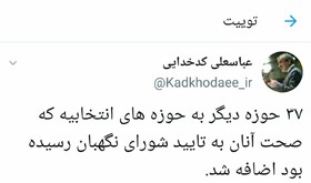 به گزارش ایسنا، عباسعلی کدخدایی در توییتر نوشت: "37 حوزه دیگر به حوزههای انتخابیه که صحت آنان به تایید شورای نگهبان رسیده بود اضافه شد."
