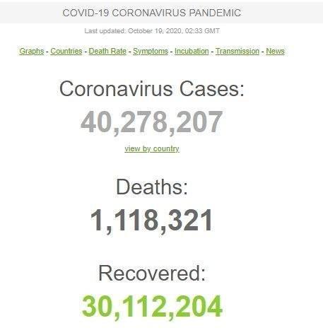 تعداد مبتلایان به ویروس کرونا در جهان به 40 میلیون و 278 هزار و 207 نفر رسید از این تعداد 1 میلیون و 118 هزار و 321 نفر جان باخته و 30 میلیون و 112 هزار و 204 نفر بهبود پیدا کرده اند.