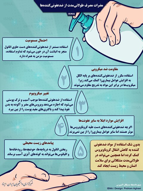 در این اینفوگرافیک به برخی از مضرات استفاده مداوم از مواد ضدعفونی کننده اشاره شده است.